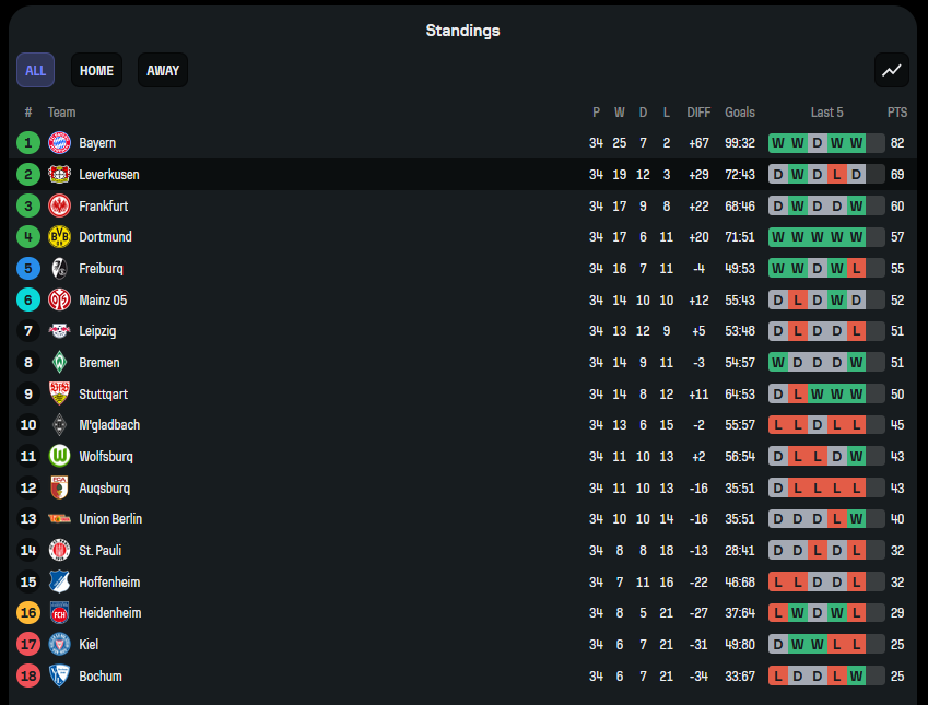 After 34 grueling matchdays, VfL Bochum and Holstein Kiel were relegated directly. Both teams suffered 21 defeats and conceded over 65 goals. Kiel's -31 goal difference proved decisive in a tight bottom-three race. Meanwhile, Heidenheim (16th) will contest the relegation playoff in hopes of surviving another season in the top flight.